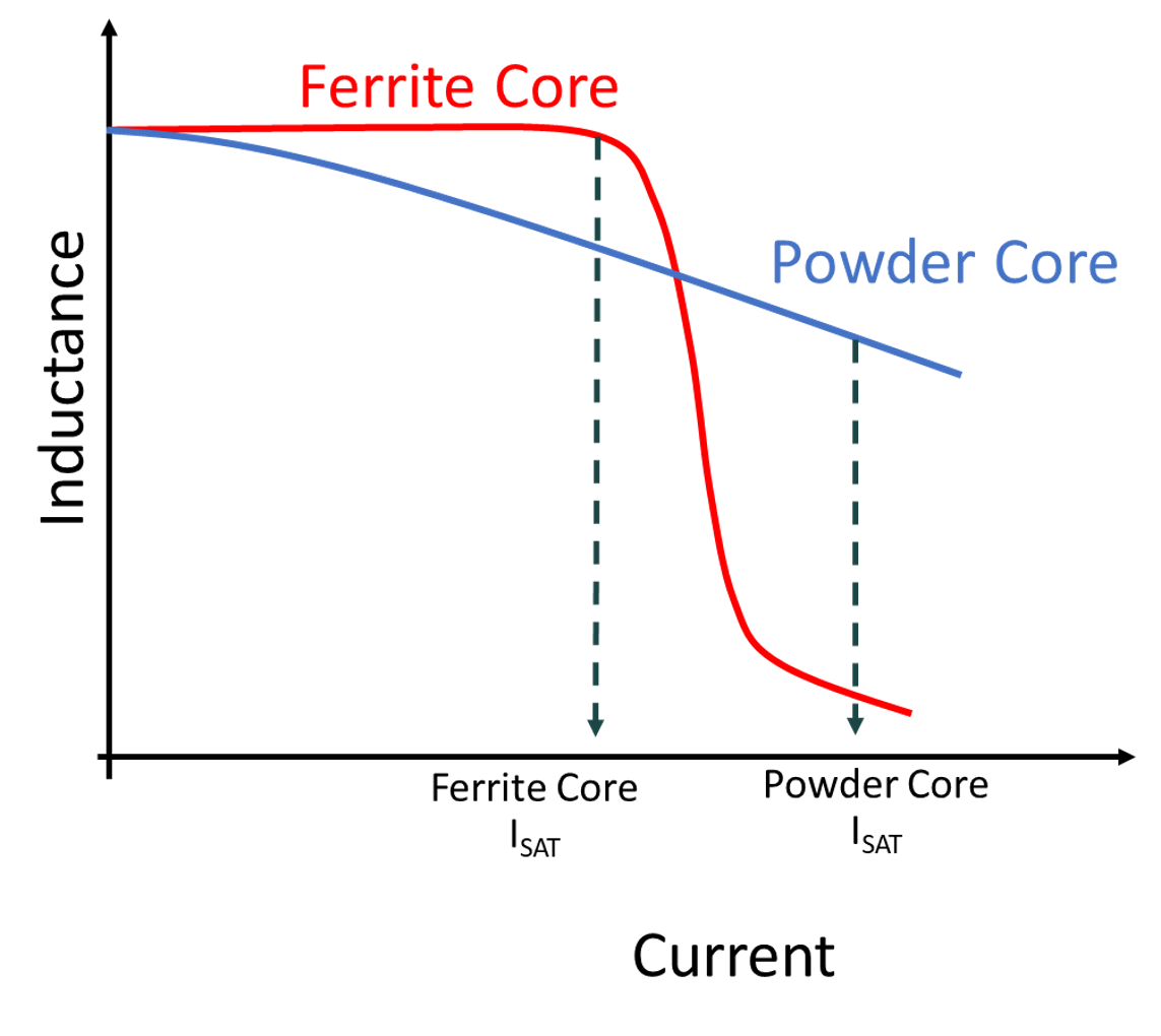 Inductance vs current roll off is a critical factor when selecting between ferrite and iron powder materials for inductors. Ferrite materials have a hard roll off, with minimal inductance change vs current up to the saturation current, but a sharp drop in inductance when the current approaches and exceeds the saturation current. Ferrite materials are also sensitive to changes in operating temperature, but offer higher efficiency.