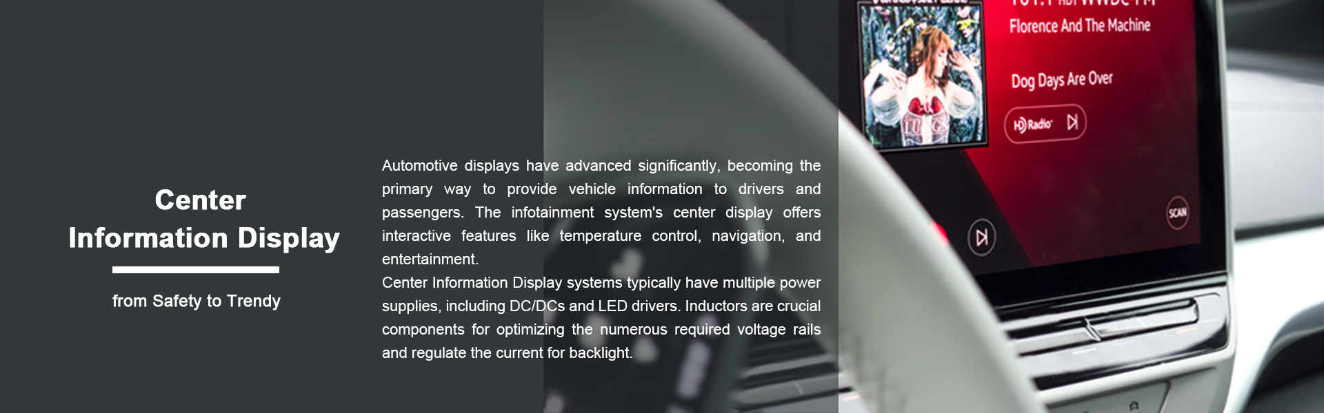 Andex provides a wide range of power inductors to suit car display requirements. Their molding power inductors offer superior current handling capability and temperature stability, while our ferrite power inductors provide better efficiency and wide range of inductance. Single and dual coupled inductors are available, making them suitable for a variety of applications such as DC/DC or filtering.